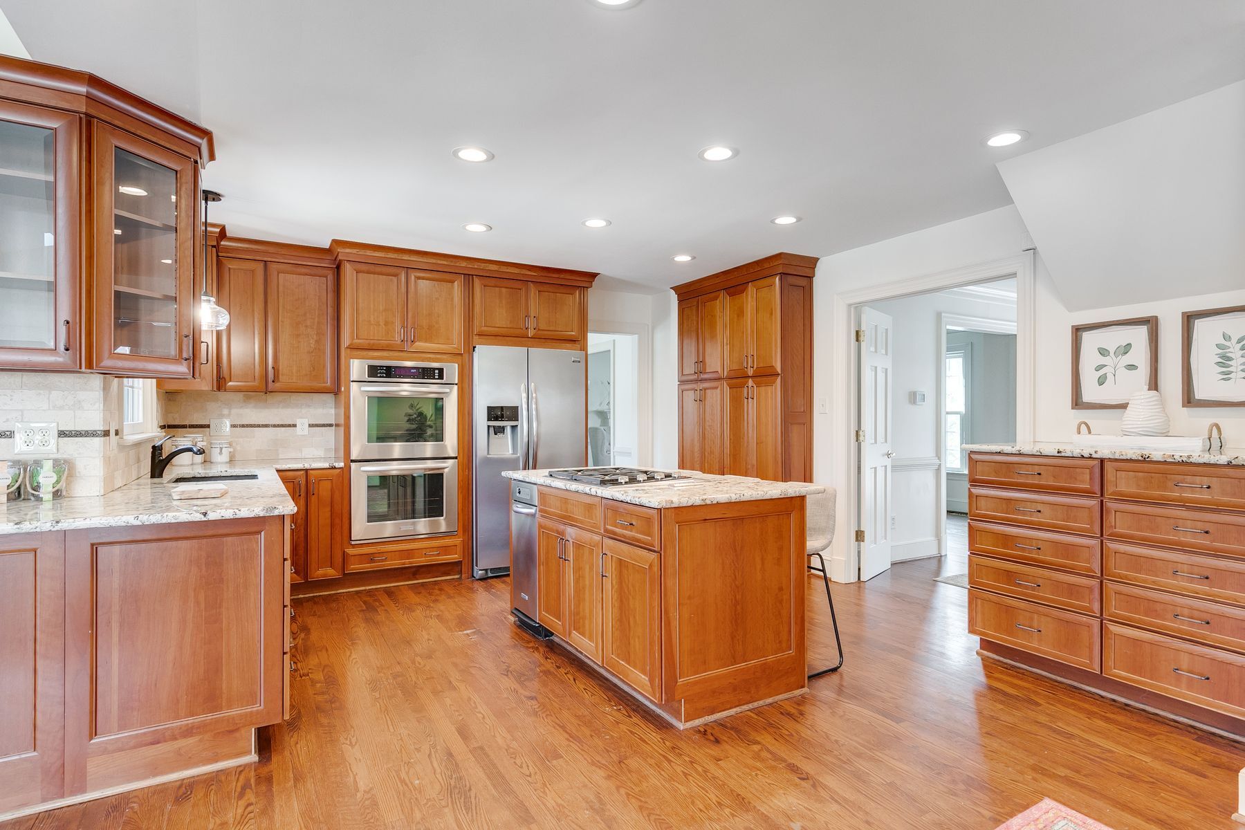 Set back from the road on a nearly one-acre corner lot and surrounded by mature trees, this stately brick Colonial is just a stone’s throw from Lake Salisbury and a true gem in the sought-after Glamorgan neighborhood. Hardwood floors, beautiful millwork, and three fireplaces lend timeless character throughout the home. A welcoming central foyer offers a front-to-back view, while wide doorways create effortless flow between rooms. The spacious living room makes a striking first impression with its built-ins and fireplace, and the elegant dining room features a wall of windows overlooking the serene backyard. The open and airy kitchen is thoughtfully designed for both everyday living and entertaining, with granite countertops, an island with seating, high-end stainless steel appliances, including double ovens and gas cooking, and an abundance of cabinetry. The kitchen flows seamlessly into a spectacular family room anchored by a beautiful brick hearth, as well as a sunny morning room and adjoining sunroom. Upstairs, the spacious primary suite is a true retreat, featuring a large bedroom, en-suite bathroom with double-sink vanity and oversized shower, a walk-in closet, and an attached den or office complete with a fireplace, built-ins, and two additional walk-in closets, all with brand-new carpet. Two additional second-floor bedrooms each offer their own dedicated bathroom. The third floor provides even more flexibility with a fourth bedroom, full bath with shower, and a rec room or den area, also featuring brand-new carpet. Outdoor living is equally inviting, with a rear deck ideal for relaxing or grilling, a fenced backyard, a destination fire pit, and mature landscaping meticulously maintained by an experienced and loving gardener. An irrigation system services both the front and back yards. Additional highlights include a large circular paved driveway connecting to the cul-de-sac street, an attached two-car garage, and a peaceful, private setting in one of the area’s most desirable neighborhoods.
